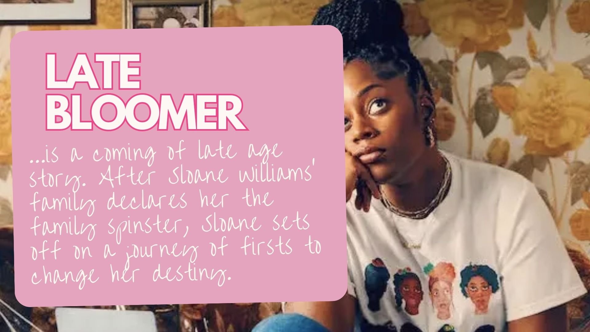 Late Bloomer follows Sloane Williams, who while planning her baby sister’s wedding, learns that she’s been dubbed the family spinster. But Sloane’s been a victim of eldest daughter syndrome.